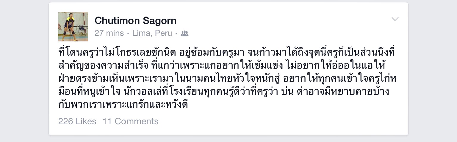 เพราะตอนแข่งที่เปรูคราวก่อนโดนทั่งโค้ช แล้วแฟนวอลเลย์บอลกระหน่ำเละเลย..ตอนนี้เลยรับได้ทุกสถานการณ์ ชิวๆ
