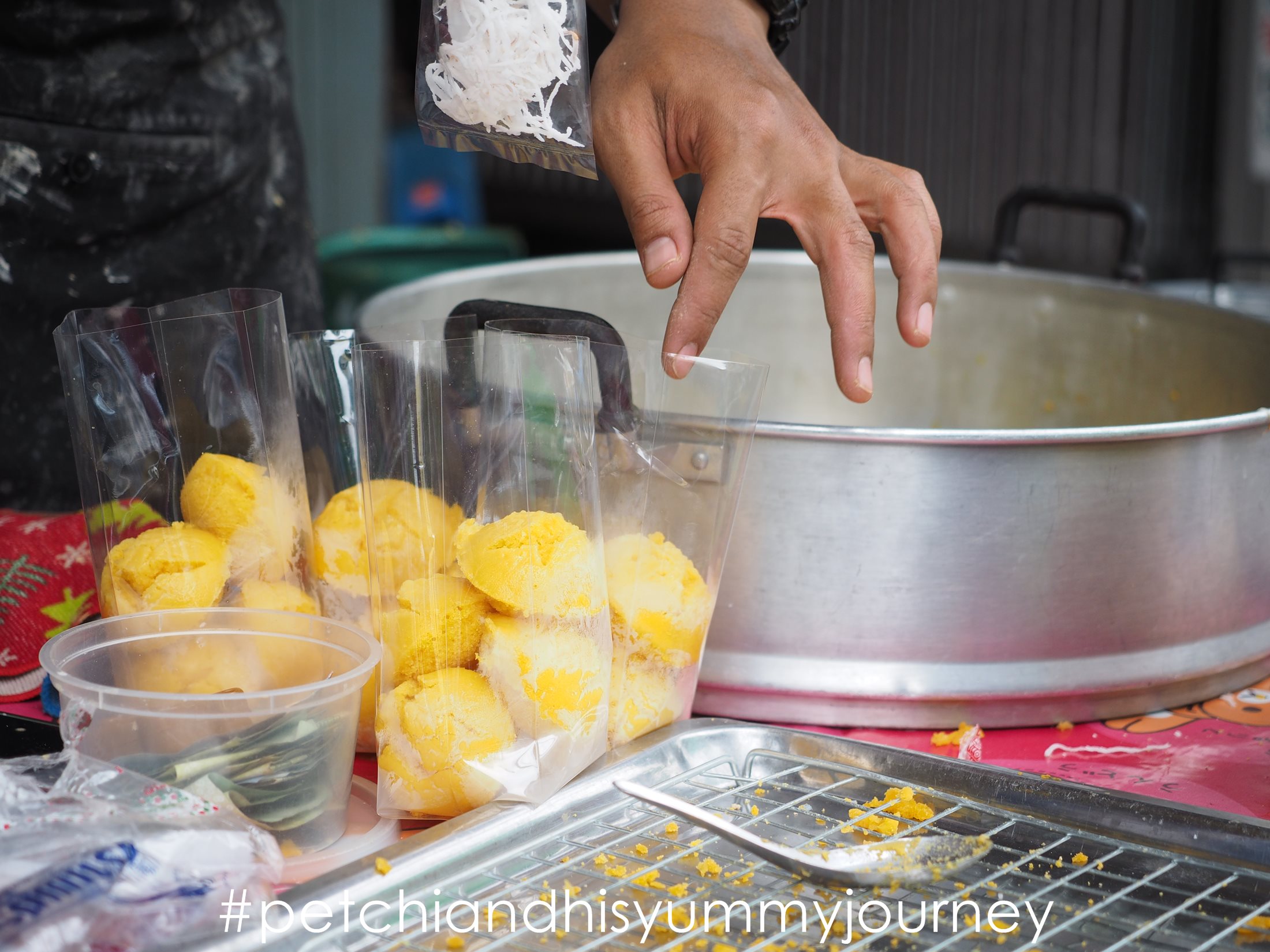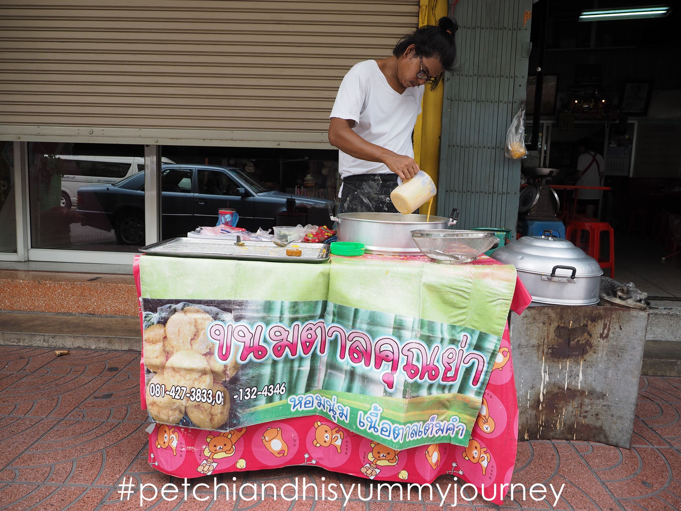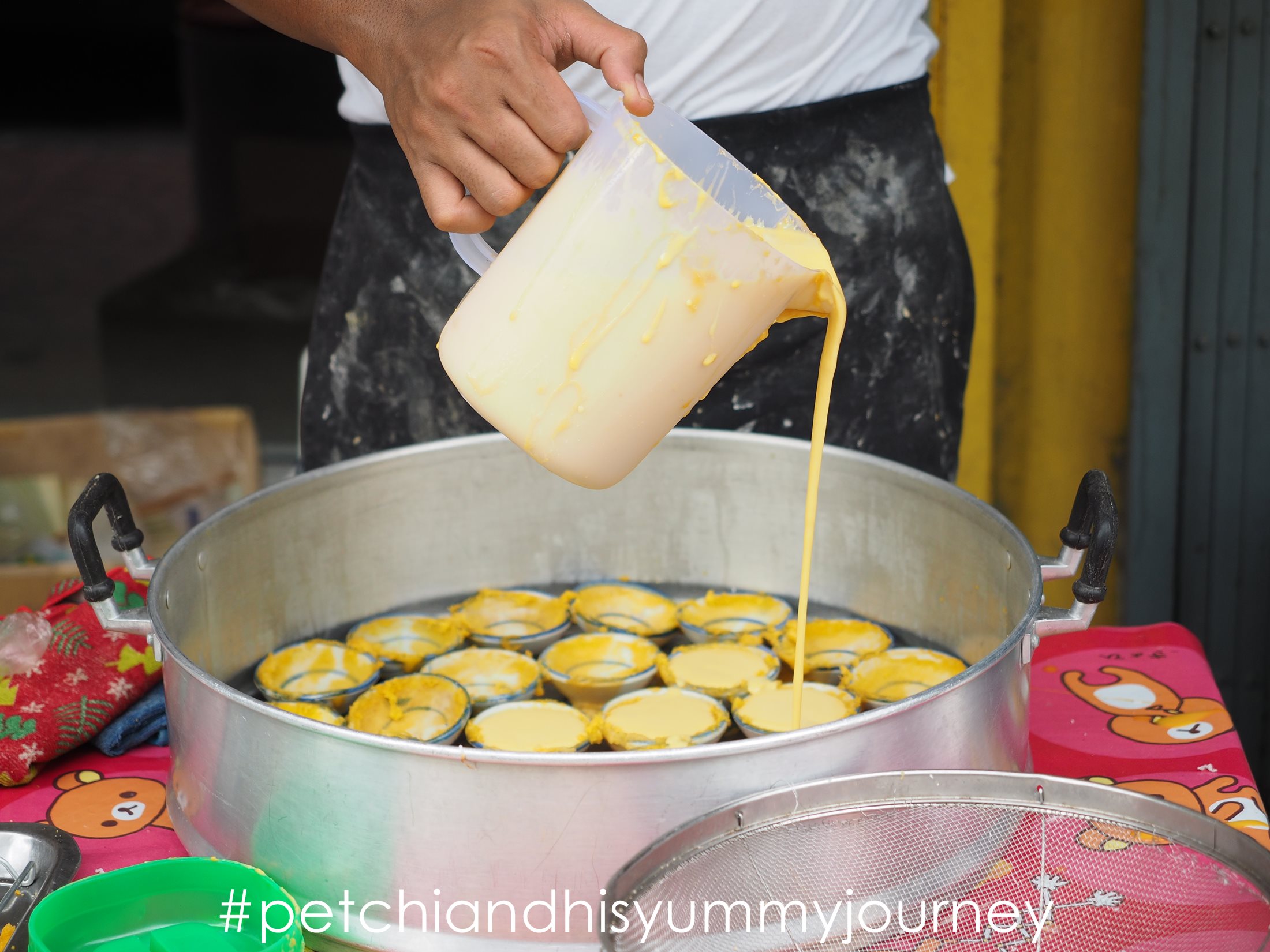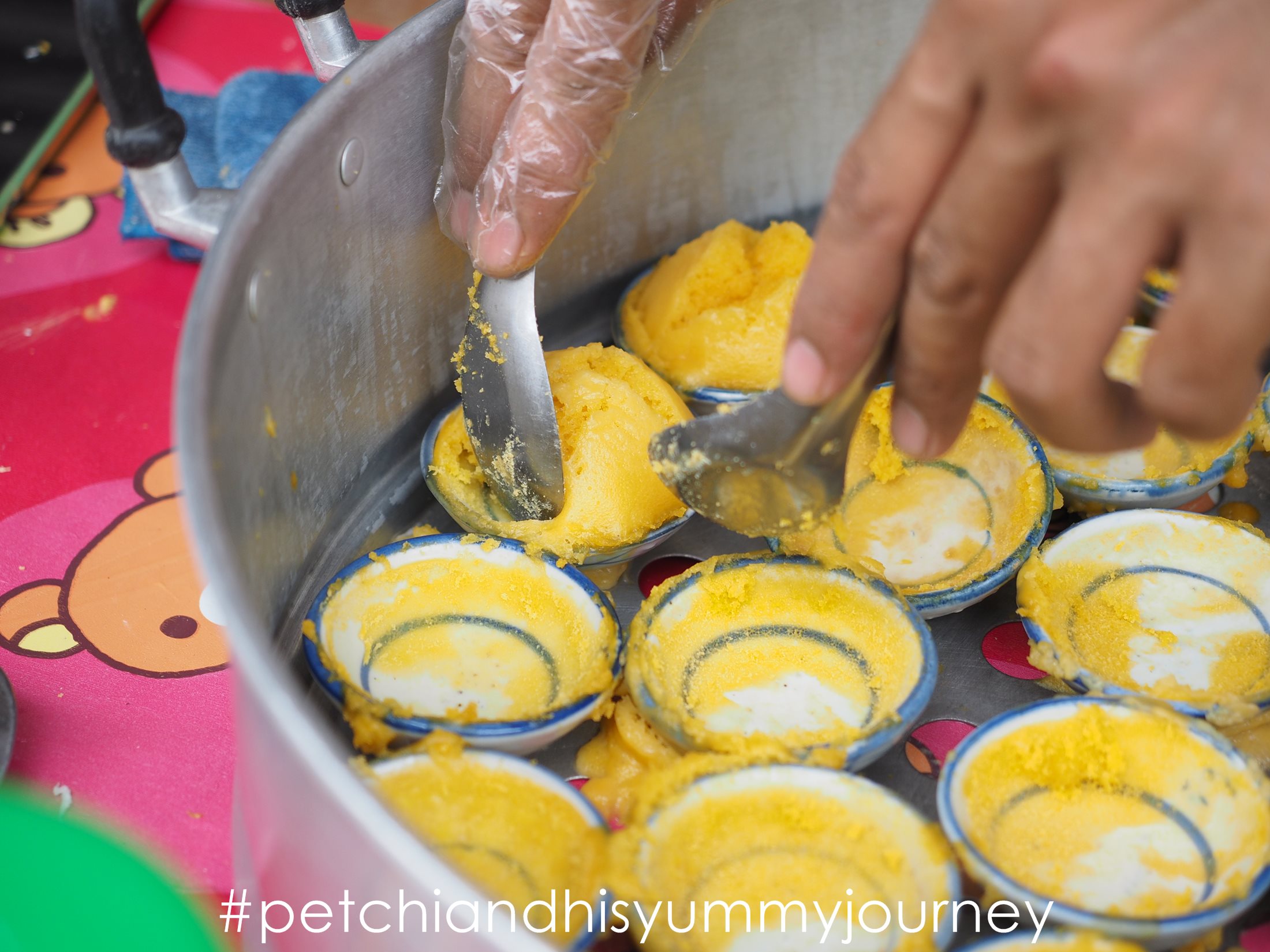 มือหยาบกร้านที่ผ่านประสบการณ์ทำงานอย่างหนักกำลังจับภาชนะที่ใส่แป้งสีเหลืองครีม หยอดลงถ้วยใบน้อยมีลายขลิบสีน้ำเงินอย่างชำนาญ “อ๋อ ขายตรงนี้วันเสาร์วันเดียวครับ ตั้งร้านประมาณ 9-10 โมงเช้า” เสียงพ่อค้าหนุ่มตอบกลับมา พร้อมทั้งยกซึ้งตั้งบนเตาไฟ