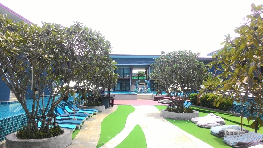 มองเข้าไปเป็นสระน้ำ กับ ห้องพัก
