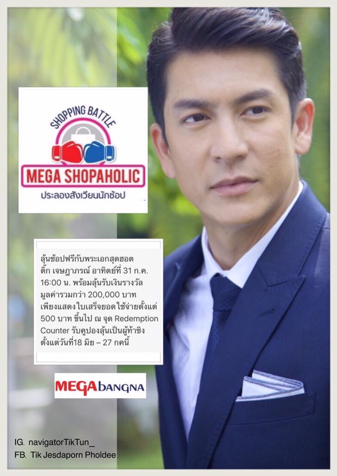เมกาบางนา จัดกิจกรรมเอาใจนักช้อปช่วงมิดเยียร์เซลล์ด้วยแคมเปญ “Mega Shopaholic 2016” (เมกา ช้อปอะฮอลิค 2016) ให้ลูกค้าเต็มอิ่มกับการช้อปปิ้งสินค้าจากหลากหลายแบรนด์ลดราคาสูงสุด 80% พร้อมสนุกสุดๆ ไปกับ 2 กิจกรรมพิเศษ Shopping Battle ประลองสังเวียนนักช้อปลุ้นช้อปฟรีกับดารา และ คุณช้อปเราจ่ายให้ 50% ลุ้นช้อปฟรีแบบแพคคู่กับดาราสุดฮอต ติ๊ก เจษฎาภรณ์ (31 ก.ค.) พร้อมลุ้นรับเงินรางวัลมูลค่ารวมกว่า 200,000 บาท เพียงแสดงใบเสร็จยอดใช้จ่ายตั้งแต่ 500 บาท ขึ้นไป ณ จุด Redemption Counter รับคูปองลุ้นเป็นผู้ท้าชิงตั้งแต่วันที่18 มิถุนายน – 27 กรกฎาคม 2559 จับรางวัลและประกาศรายชื่อผู้โชคดีในวันที่ 6, 13, 20, 26 กรกฎาคม 2559 ทาง www.facebook.com/megabangnashoppingcenter