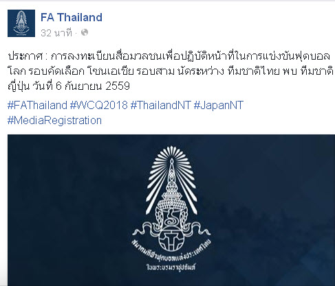 ประกาศ : การลงทะเบียนสื่อมวลชนเพื่อปฏิบัติหน้าที่ในการแข่งขันฟุตบอลโลก รอบคัดเลือก โซนเอเชีย รอบสาม นัดระหว่าง ทีมชาติไทย พบ ทีมชาติญี่ปุ่น วันที่ 6 กันยายน 2559