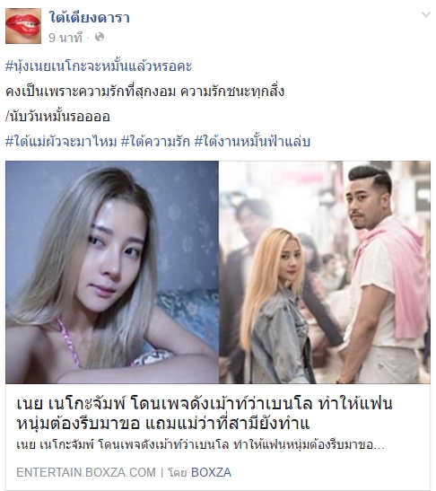 เนย เนโกะจัมพ์ โดนเพจดังเม้าท์ว่าเบนโล ทำให้แฟนหนุ่มต้องรีบมาขอ
