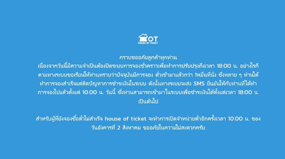 สำหรับผู้ที่ยังจองซื้อตั๋วไม่สำเร็จ house of ticket จะทำการเปิดจำหน่ายตั๋วอีกครั้งเวลา 10.00 น. ของวันอังคารที่ 2 สิงหาคม ขออภัยในความไม่สะดวกครับ