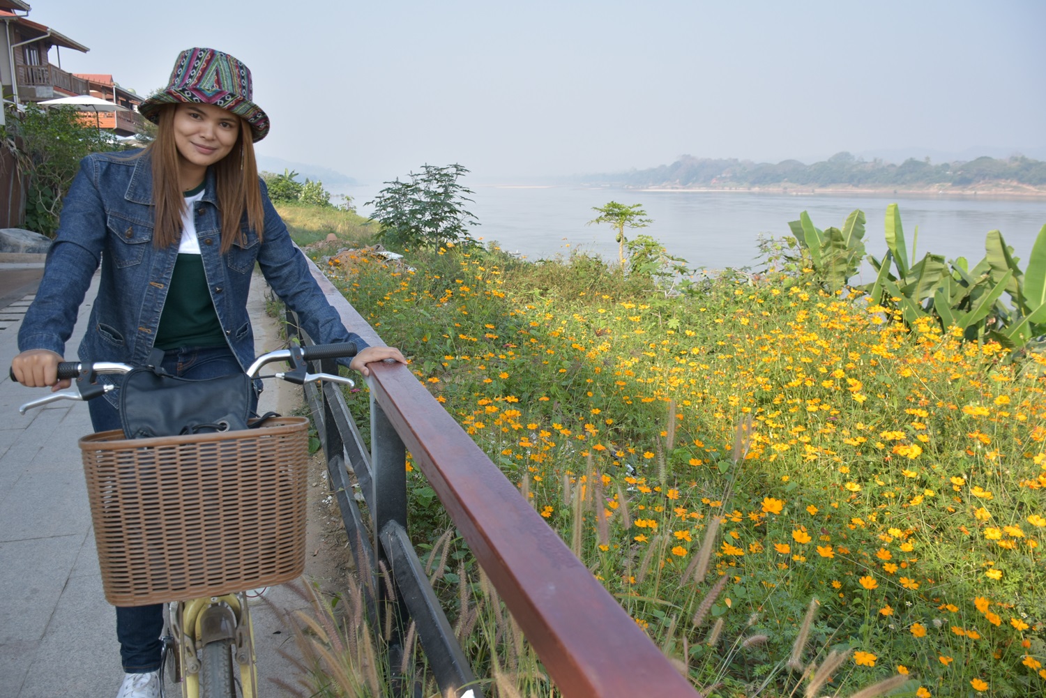 แต่...........กว่าจะถึงโฮมสเตย์ เดินแวะกินขนมข้างทางไปเรื่อยๆ ขนมครกบ้าง โน่นนี่นั่น บลาๆๆ แวะแม้กระทั้งโลตัสเอ็กซ์เพลส 55+ (สาย-กันทั้งคู่ เรื่องกินไม่เคยมีคัยห้ามคัยได้ ) ประมาณ 8 โมง ก็มาถึงที่พัก ห้องพักยังไม่ว่าง คนพักเก่ายังไม่ถึงเวลาเช็คเอ้าท์ คุณลุงลูกเจ้าของโฮมสเตย์เลยแนะนำให้ปั่นจักรยานชมบรรยากาศริมโขงฆ่าเวลาไปก่อนค่ะ ความประทับใจแรกของที่นี่คือ บริการดีดุจญาติมิตร อยากรู้หรืออยากได้ข้อมูลอะรัยถามคุณลุงและลูกชายได้หมดเลยค่ะ ยืนสนทนาเม้ามอยกันพักใหญ่ก็จับจักรยานคนละคันมาปั่นริมโขง หื้มมมมมมมมมมมมมมมม บรรยากาศช่างดีเสียเหลือเกิน ฝรั่งที่ปั่นสวนทางกันก็งานดี๊ดี หันมองตามหลังไปจนคอแทบเคล็ด แล้วสติก็กลับมาเมื่อสายตาไปจ้องกับแฟนที่ปั่นตามหลังมาพอดี บึ๋ยยยย ยิ้มเจื่อนๆแล้วบอกแฟนว่า เค้าหันมามองว่าตัวเองปั่นตามมามั้ย เฉยๆ ---> แฟน :