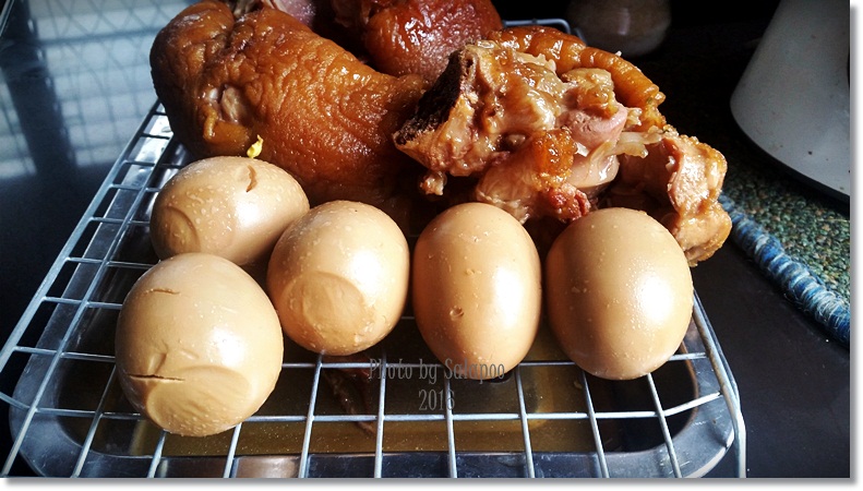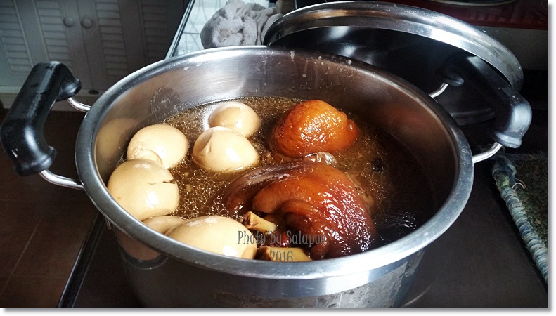 จัดการหยิบนั่นหยิบนี่โยนลงไป เช่น โป๊ยกั๊ก กระเทียมสด อบเชย แต่งสีด้วยซีอิ้วดำ ปรุงรสเพิ่มด้วยซีอิ้วขาว