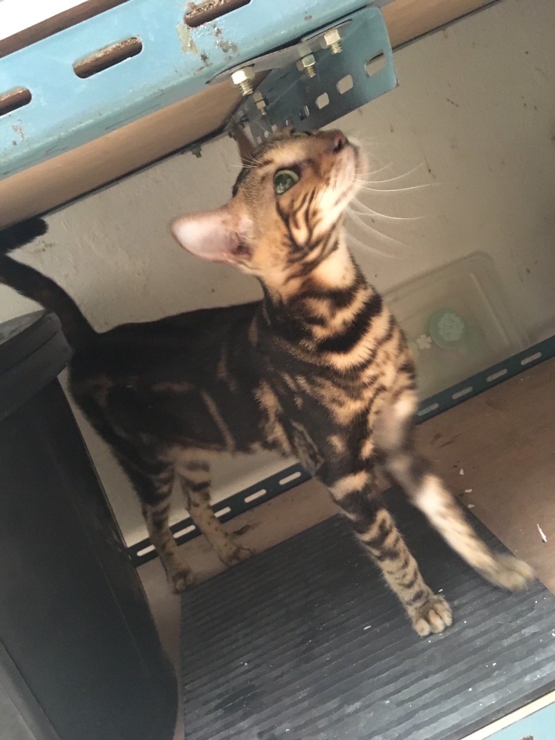ผมได้แมว เบงกอล พันธ์ุผสม อเมริกัน ช็อตแฮร์ มาตัวหนึงครับ ค่อนข้างโตแล้ว ได้มาเมื่อวานมันตื่นกลัวมาก แต่วันนี้มันเดินเข้าหาแล้วครับน่าจะคุ้นเคยกับคนครับ