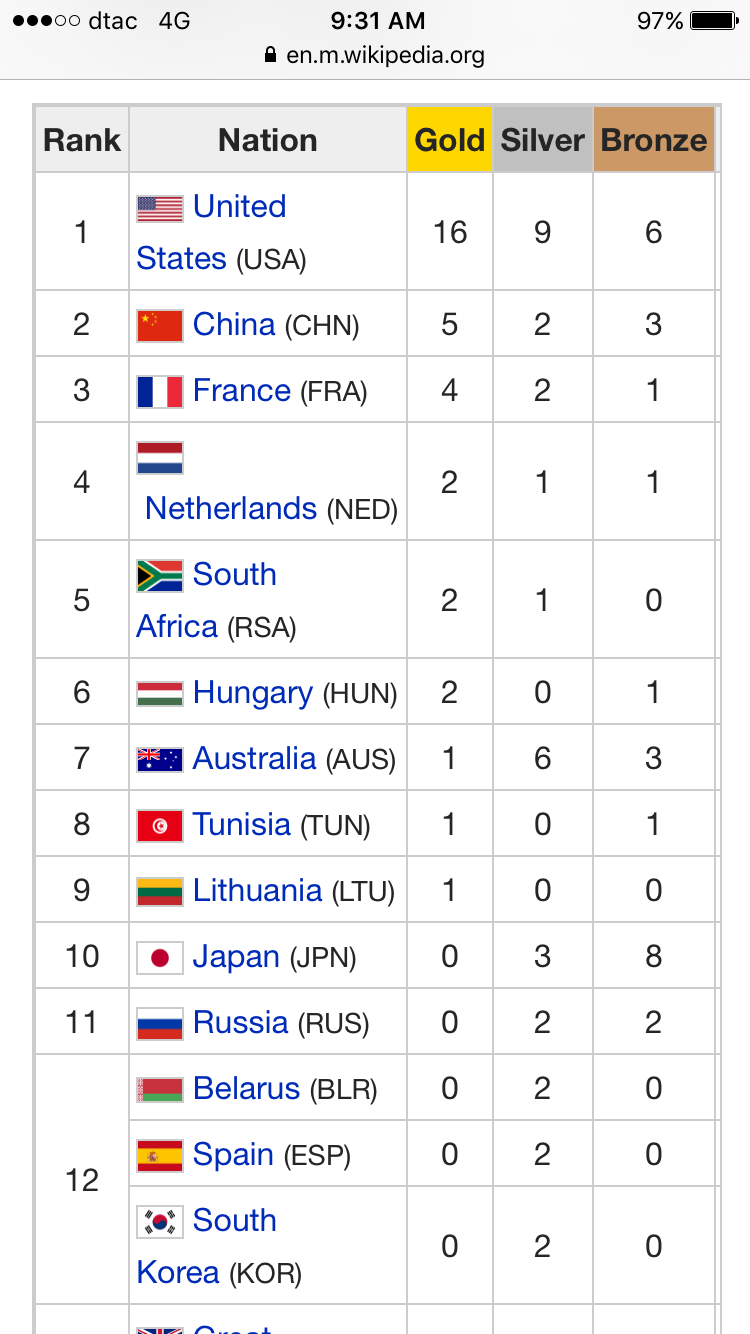 จำได้ว่าติดตามว่ายน้ำถึงโอลิมปิค 2012 และไม่ได้ดูตามต่อ ออสเตรเลียปีนั้นได้แค่ 1 เหรียญทองเองนะ กลับมาดูปีนี้ ได้ 9 เหรียญทอง !!!! เป็นรองเมกาแค่ 2 เหรียญทองเอง (เมกาได้ 11 เหรียญทอง) ไปทำไรมา โหดเว่อ