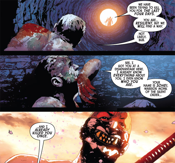 [Spoil] คลิกเพื่อดูข้อความที่ซ่อนไว้โลแกนตกบ่อ พยายามจะไต่ขึ้นก็โดนคนที่เฝ้าอยู่ยิงธนูให้ร่วงลงมา โลแกนบอกไม่ต้องเสียเวลาหาวิธีฆ่าเขาหรอก เขามาจากอนาคตรู้ดีว่าเอ็งเป็นใคร เพราะเขาเคยฆ่าไปกับมือแล้ว