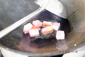 1. เปิดไฟให้กะทะร้อนๆ ก่อนเอาน้ำมันลง หรี่ไฟกลาง เอาหมูแฮมลงไปผัดพอเข้าเนื้อ และค่อยใส่กะเทียมลงไปเคล้ากัน