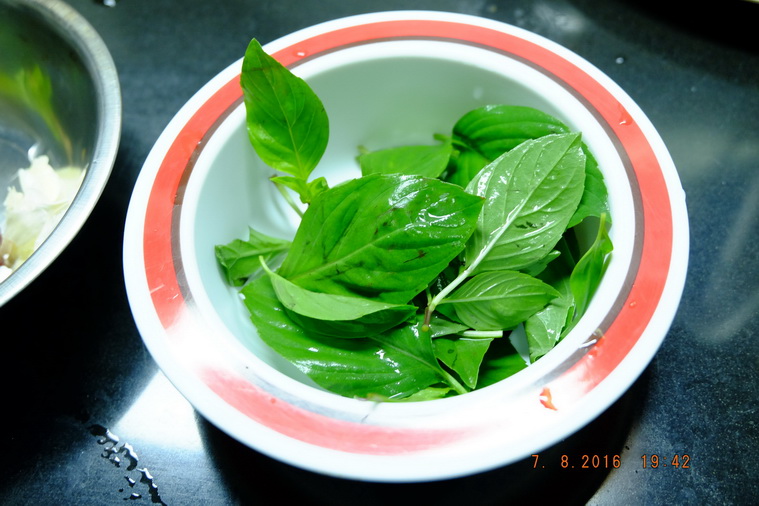 ใส่พริก และ โหระพา และยกใส่จาน ตกแต่ง เสิร์ฟได้เลย