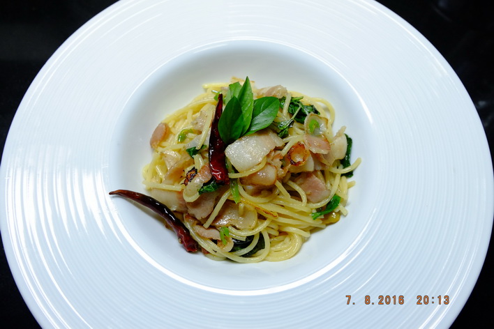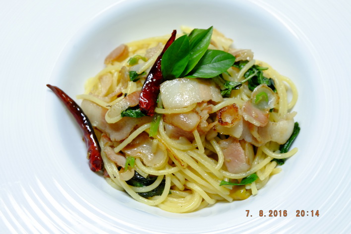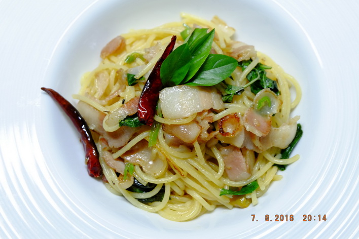 แบ่งปันครับ "สปาเก๊ตตี้เบคอน โหระพา" รสชาติเผ็ดๆ แบบไทย เครื่องปรุงนิดเดียว ภรรยาผมชอบ