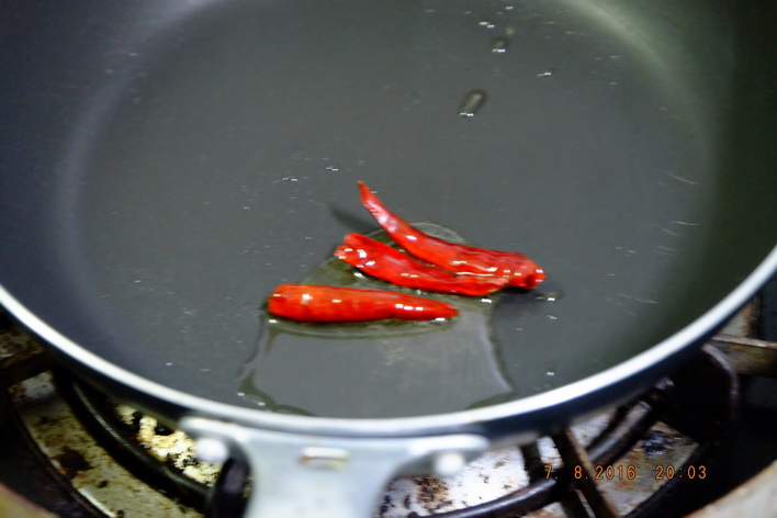 1.ก่อนที่จะถึง เก้านาที สักนาทีที่ 7 ก็ใส่น้ำมันลงไปสัก 1 ช้อนโต๊ะ คั่วพริกแห้งให้หอมๆ อีกนิดหน่อย ไฟกลางๆ แล้วค่อยตักพริกออกพักไว้ก่อน