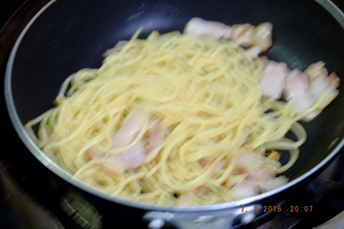 2.ใส่กระเทียมลงไปผัด แล้วตามด้วยเบคอน ผัดให้หอม ไม่ต้องเกรียมมากนัก เพราะเดี๋ยวเราต้องผัดต่อ ตอนนี้ลองดูว่า เส้นได้ 9 นาทีหรือยัง ผมจะยกเส้นลงไปผัดเลย ไม่ได้พักไว้ ไม่ได้สะเด็ดให้แห้งใดๆ