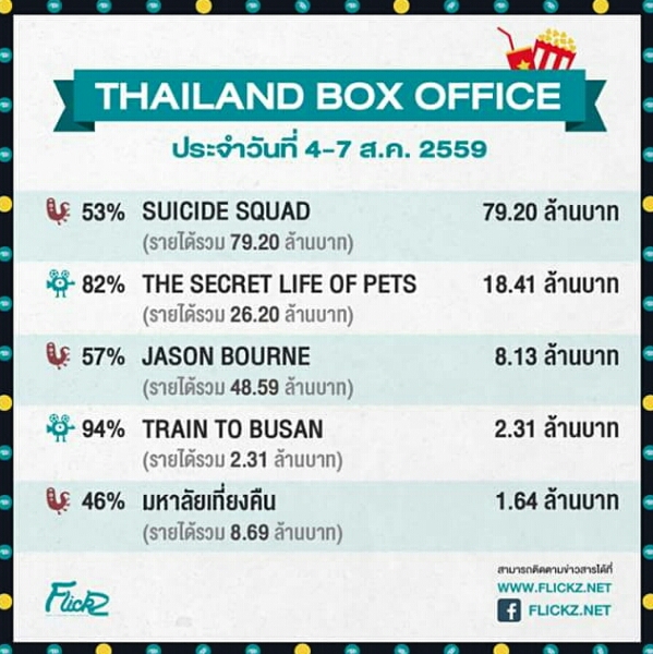 อัพเดตรายได้หนังในบ้านเรา ประจำำวันที่ 4 สิงหาคม 2559 !!