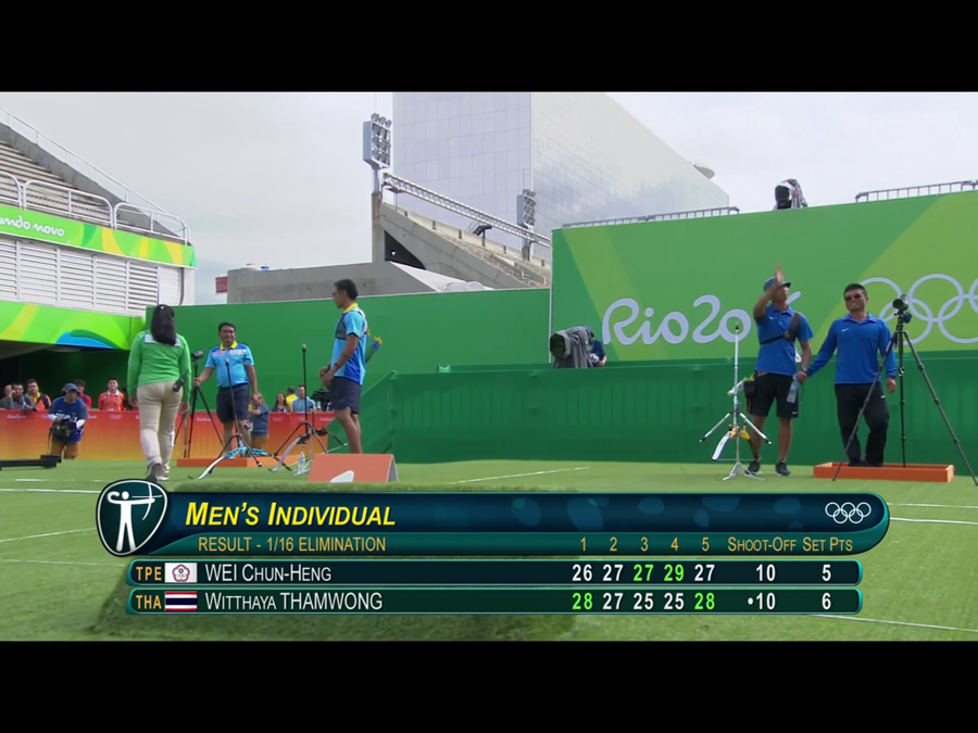เมื่อกี้เราแข่งกะไต้หวันรอบ 16 คน เล่นกันห้าเซ็ทยังเสมอ ต้องยิงตัดสินดอกสุดท้าย ไต้หวันยิงก่อน เข้าตรงกลางได้ 10 บีบนักกีฬาเรามาก พอตาเรายิงบ้าง เรายิงเข้า 10 แต่ตรงกลางมากกว่าเลยชนะไปเลย ห่างกันแค่ไม่กี่เซนเอง บีบมากแต่ทำได้ เก่งมาก ๆ เลยครับ