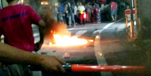 ระเบิดเพลิงจำนวน 6 ลูก ที่ทำจากน้ำมันบรรจุในขวดแก้วถูกขว้างจากชั้น 3 ของอาคารหลังหนึ่งเข้าใส่ท้องถนนอย่างต่อเนื่อง ทำให้มีผู้ได้รับบาดเจ็บ 15 ราย แต่ไม่มีอันตรายถึงชีวิต
