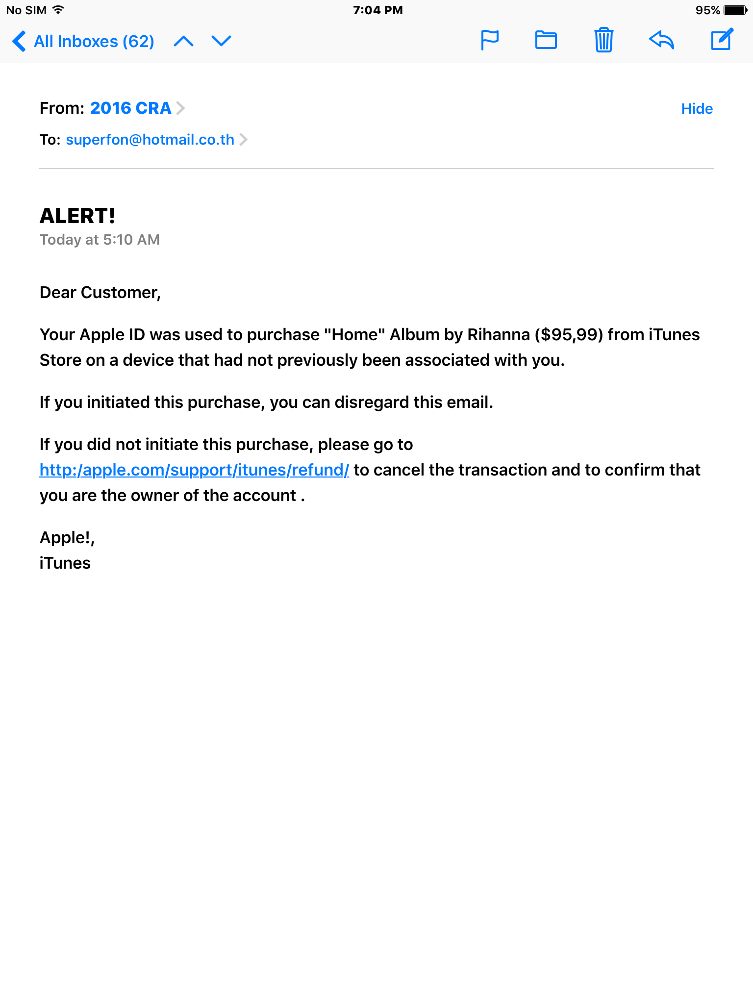 เตือนภัยครับ อย่าหลงเชื่อ!!! เมล์จาก iTunes แจ้งว่ามีคนพยายามใช้ Apple ID ของคุณเพื่อซื้อสินค้าครับ
