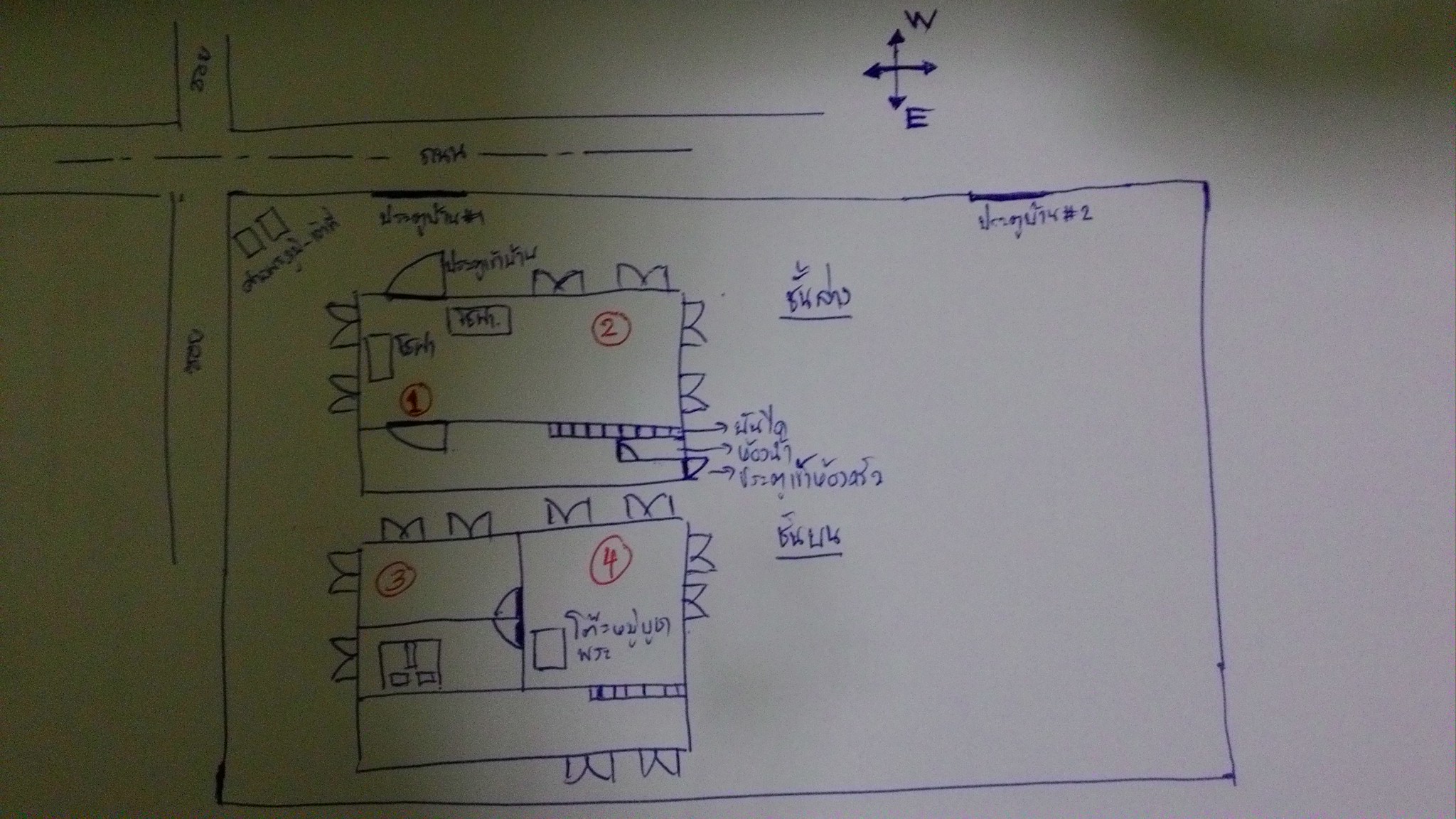 ต้องการสอบถามค่ะ 1. จะต่อเติมบ้านเพิ่มเติม ตามเส้นที่ลากเป็นสีแดง ด้านหลัง จะทำเป็นห้องนอน และลานบ้านไว้นั่งเล่น ส่วนห้องนอนเดิม (ที่มีเลข1) จะมากั้นเป็นห้องพระเล็กๆ และ เป็นห้องทำงาน หรือ ห้องแต่งตั