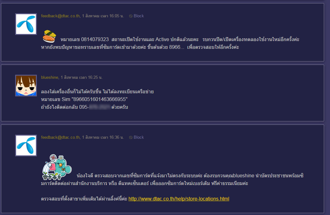 จากที่เคยสอบถามเกี่ยวกับซิมพี่ที่ Office ซึ่งไปรับใหม่เพราะซิมหาย แต่ซิมที่รับมาใช้ไม่ได้ทาง Feedback ก็ตอบกลับมาว่า