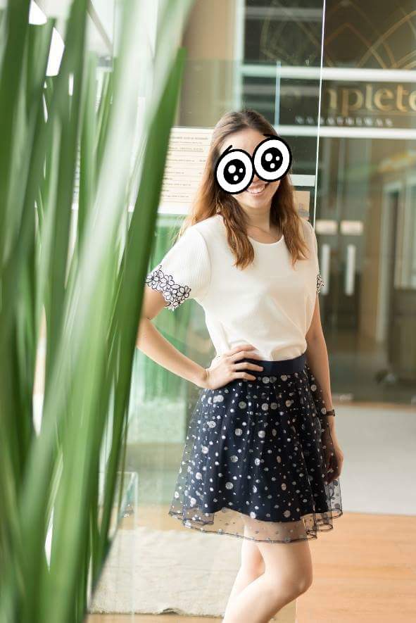 A014 กระโปรงสีกรมลายจุดสีเงิน เอว 28” ยาว 17” ราคา 50 บาท