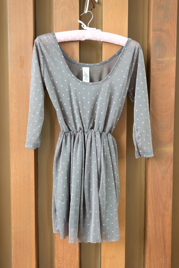 A024 เดรสสีม่วงลายจุดสีน้ำตาล อก 32” เอวยืดได้ถึง 30” ยาว 30” ราคา 70 บาท