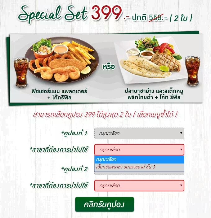 เงื่อนไข สำหรับการรับประทานภายในร้านเท่านั้น (ไม่สามารถใช้ได้สำหรับอาหารสั่งกลับบ้านหรือบริการเดลิเวอรี่) ต้องแสดงคูปองก่อนเข้ารับบริการ (รับเฉพาะคูปองที่พิมพ์มาเท่านั้น) กรุณาชำระเงินส่วนต่างกับทางร้