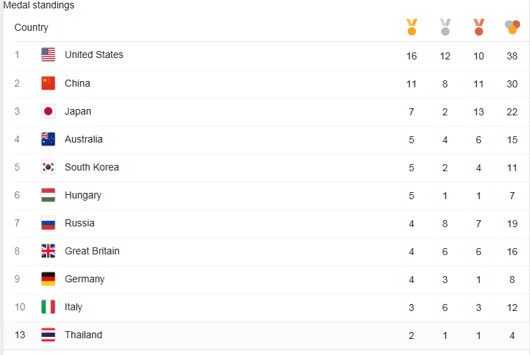 แข่งไปแล้วทั้งสิ้น29เหรียญทอง โดยอันดับ1จีนนำที่ 6เหรียญทอง จีนได้เพิ่ม3เหรียญทอง จากกีฬากระโดดน้ำ1เหรียญ และยกน้ำหนัก2เหรียญ อันดับ2เป็นญี่ปุ่นที่เก็บเพิ่มอีก4เหรียญทอง จากกีฬาว่ายน้ำ1เ