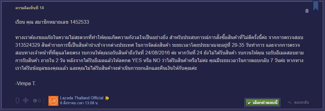 วันนี้ผมได้รับอีเมล์แจ้งบอกว่าผมได้รับสินค้าจาก LAZADA เรียบร้อยแล้ว ซึ่งสินค้าที่แจ้งบอกว่าได้รับเป็นสินค้าที่ยังติดปัญหากับทาง LAZADA อยู่ ปัญหาของสินค้าคือผู้ขายจากต่างประเทศ (จีน) ส่งสินค้าหรืออาจไม่ส่งสินค้ามาทำให้ล่าช้ากว่ากำหนดที่ทาง LAZADA แจ้งไว้ และผมก็ได้โทรไปจะยกเลิกสินค้าชิ้นนี้แต่ทาง LAZADA แจ้งว่ายกเลิกไม่ได้เพราะทางผู้ขายแจ้งว่ามีส่งสินค้ามาวันที่ 21/7 ซึ่งสินค้าสั่งซื้อเมื่อวันที่ 9/7 (ผ่านมา 12 วัน จึงแจ้งว่าเพิ่งส่ง) กำหนดรับสินค้าที่ทาง LAZADA แจ้งไว้คือวันที่ 25/7 ซึ่งมองดูแล้วไม่มีทางเป็นไปได้แน่นอน ตามหลักการแล้ว LAZADA ควรยกเลิกสินค้าและคืนเงินให้ผมได้เพราะผมไม่ต้องการสินค้าชิ้นนี้แล้ว เงินก็ยังไม่ได้โอนไปให้ผู้ขายยังอยู่ที่ LAZADA จนกระทั้งคนซื้อตอบกลับว่าได้รับสินค้าแล้ว LAZADA จึงโอนเงินไปให้ กลับให้ผมรอจนถึงวันที่ 24/8 แล้วทาง LAZADA ถึงจะมีอีเมล์มาถามผมว่าจะรับสินค้านี้หรือไม่