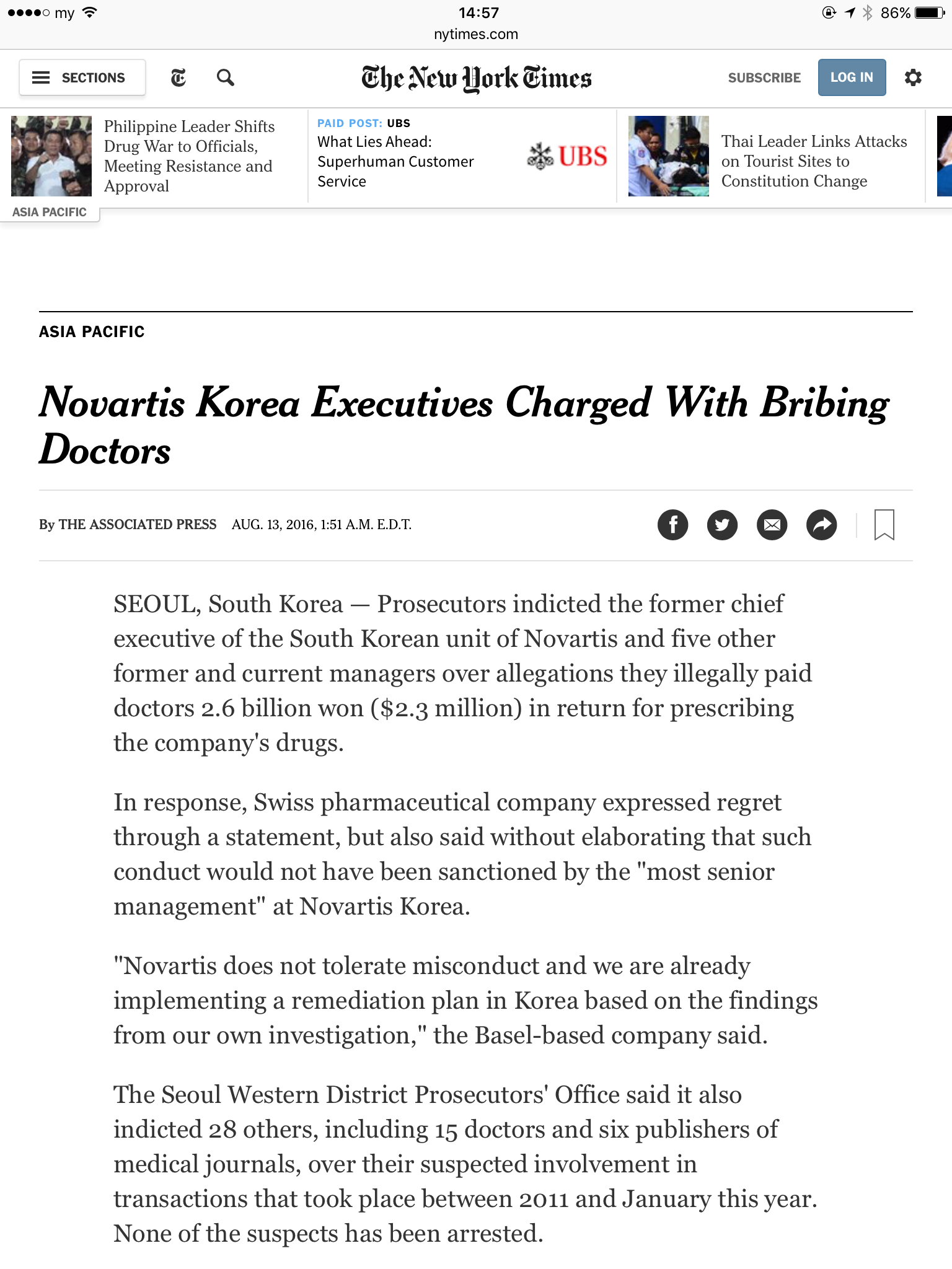 ผู้บริหารบริษัทยารายหนึ่งในเกาหลีใต้ถูกจับได้ว่าให้สินบนหมอ เพื่อให้ยาของบริษัทตัวเองเข้าสู่ระบบโรงพยาบาล