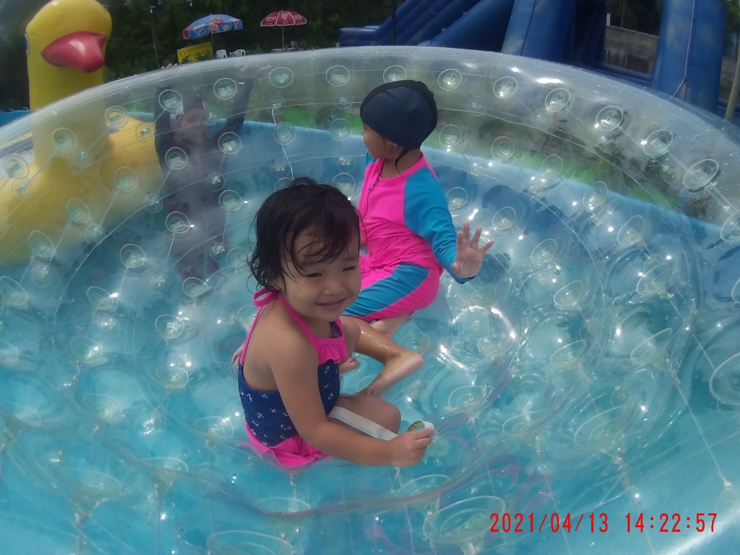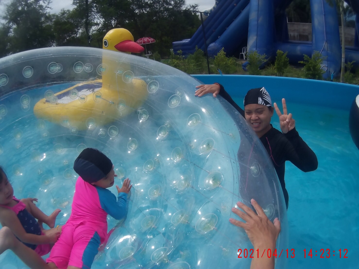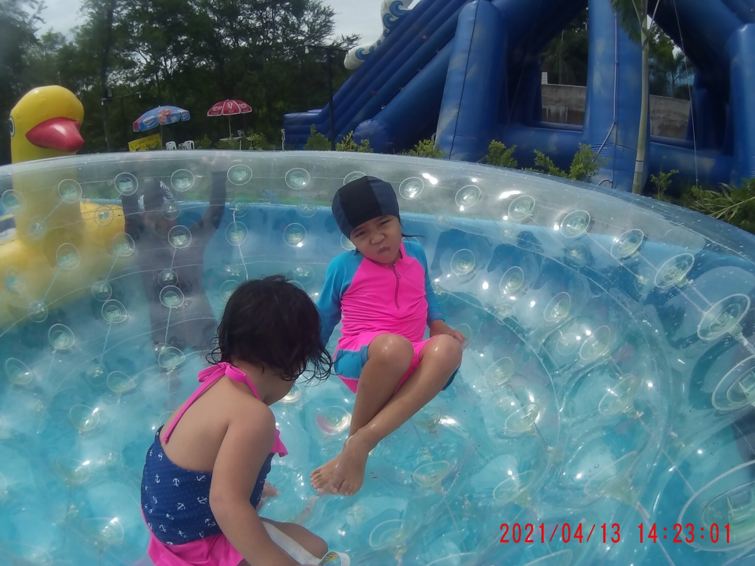 แต่มีป้ายห้ามเด็กสูงน้อยกว่า 140เซน ลงเล่น เราเอาเด็กลงเล่นเครื่องเล่นในสระ เครื่องเล่นชิ้นแรกมีลักษณะเหมือนชามใสๆ เราจับลูกสาวทั้ง 2 ใสในชาม