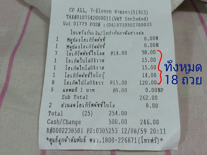 เรา: อืมมค่ะ (คิดในใจว่าเราคงอ่านรายละเอียดไม่ครบเอง) แล้วเราก็จ่าย แบงค์ 500 ไป ทอนเงินคืนมา 246 บาท พร้อมแสตมป์