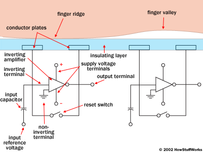 ตัวอ่านเป็น capacitive touch screen ความละเอียดสูง โดยจะอ่านการนำไฟฟ้าจากส่วนที่เป็นลายที่สัมผัสกับจอ