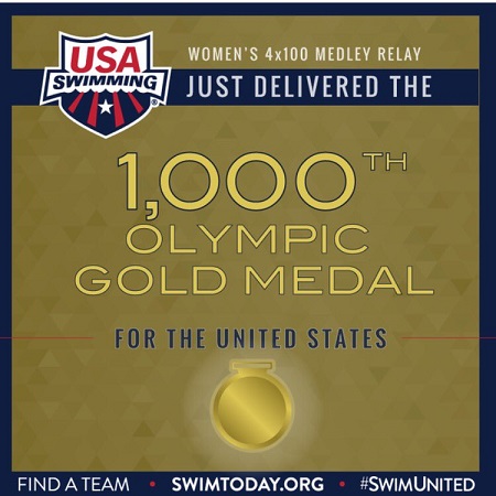 ขอแสดงความยินดีกับ Team USA เก็บเหรียญทองโอลิมปิกฤดูร้อนแตะ 1,000 เหรียญเป็นประเทศแรกในโลก หลังทีมว่ายน้ำหญิงผลัดผสมแข่งชนะ
