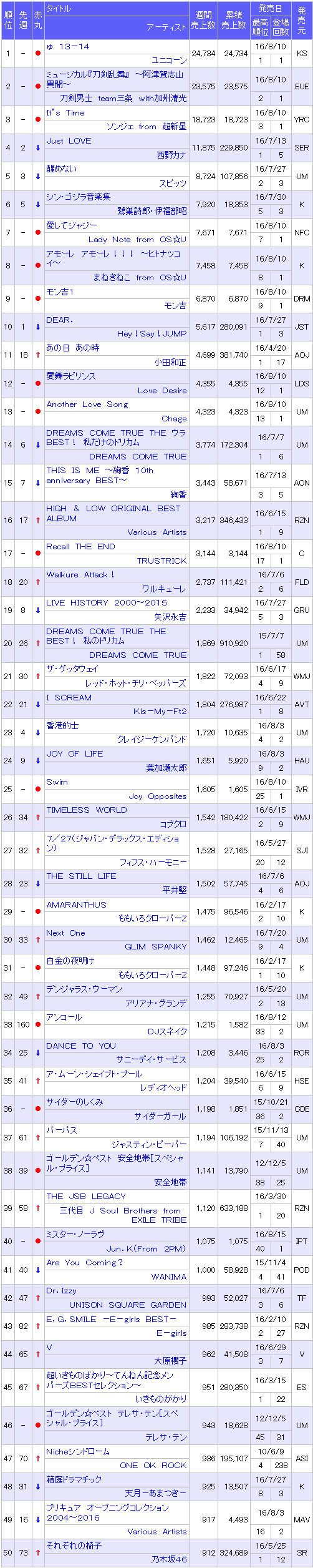 วงดนตรีในตำนานของญี่ปุ่น UNICORN จาก Hiroshima ที่ก่อตั้งเมื่อปี 1986 จะมีอายุครบ 30 ปีในปีนี้ วางขายอัลบั้มชุดที่ 13 กับอัลบั้ม 『ゅ 13-14』 (วางขายวันที่ 10 สิงหาคมที่ผ่านมา) ขายไปได้ 24,734 แผ่น ในสัปดาห์แรกขึ้นสู่อันดับ 1 ของโอริคอนชาร์ทอัลบั้มรายสัปดาห์ เป็นอัลบั้มอันดับ 1 ครั้งแรกในรอบ 7 ปี 6 เดือน นับจากอัลบั้ม 『シャンブル』[วางขายวันที่ 2 มีนาคม ปี 2009] รวมเป็นอัลบั้มอันดับ 1 ครั้งที่ 5
