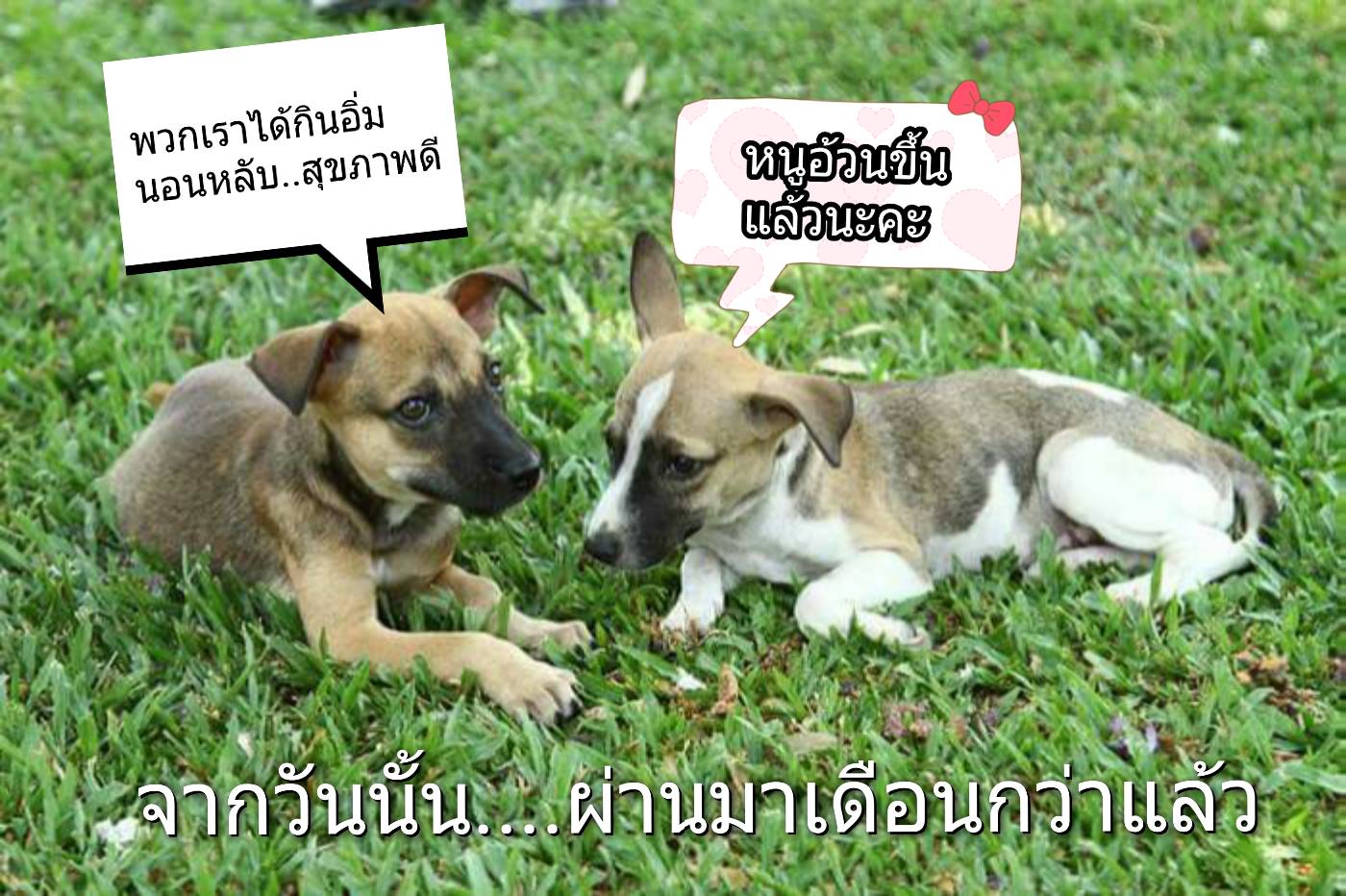 ผู้+เมีย ค่อนข้างขี้กลัว เพราะตั้งแต่ช่วยมาก็มีคุณป้ามยุรีคนเดียวที่มีโอกาสใกล้ชิดดูแลฟูมฟักจนแข็งแรง ขอโอกาสไปด้วยกันเพื่อจะได้ง่ายในการปรับตัวระยะยาว ทำหมันแล้ว วัคซีนครบ ตรวจสุขภาพที่ผ่านมา ไม่เคยมีโรคร้ายแรงใดๆ เตรียมความพร้อมให้ทุกอย่างค่ะ