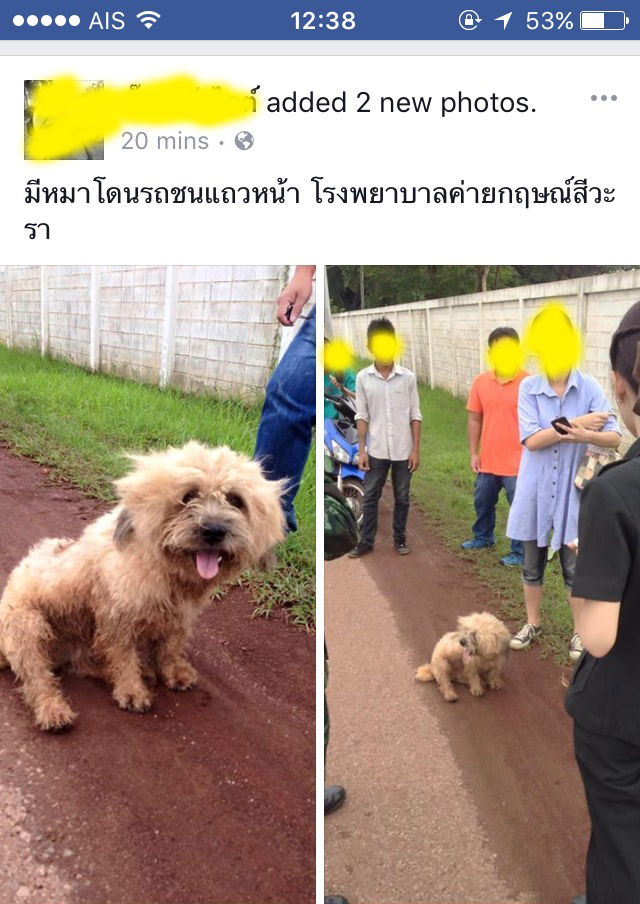 ประมาณเดือนที่แล้วช่วงเกือบเที่ยง เพื่อนผมได้แชร์รูปสุนัขโดนรถชนตัวหนึ่ง ผมเลยข้อความไปถามรายละเอียดอาการต่างๆ ว่าเป็นยังไง? อาการคือเคลื่อนที่ได้เล็กน้อยหลังจากการชน คิดว่าขาหลังน่าจะหักเพราะบวมมากและเลือดอออกจากบ้าน ผมเลยฝากให้ดูแลให้หน่อยเพราะผมว่างช่วงเย็นๆถึงจะว่างไปรับตัว