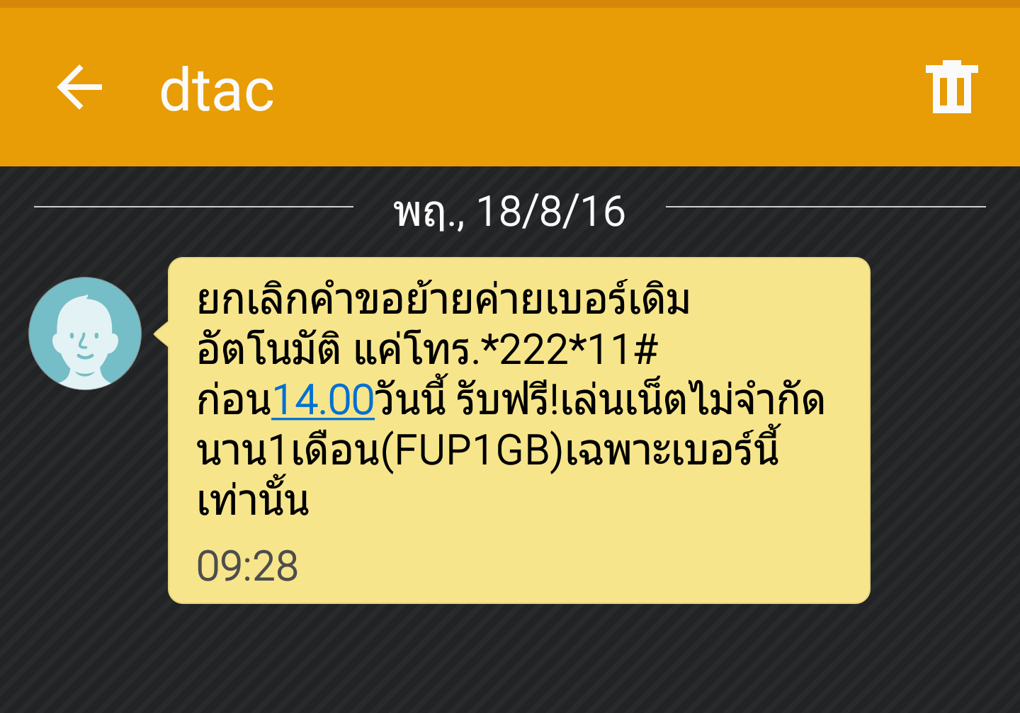 คือผมไปทำเรื่องย้ายค่ายมาอาทิตย์นึงแล้ว ครั้งแรกที่ไปทำบอกไปลงทะเบียนก็ไปติดต่อแล้ว ทำเรื่องใหม่แล้วเป็นครั้งที่สอง หลังจากกลับมา ทางดีแทคก็ส่งโปรโมชันโทรฟรีมาให้ทั้งที่ไม่ได้ถามเลยว่าอยากได้รึเปล่า