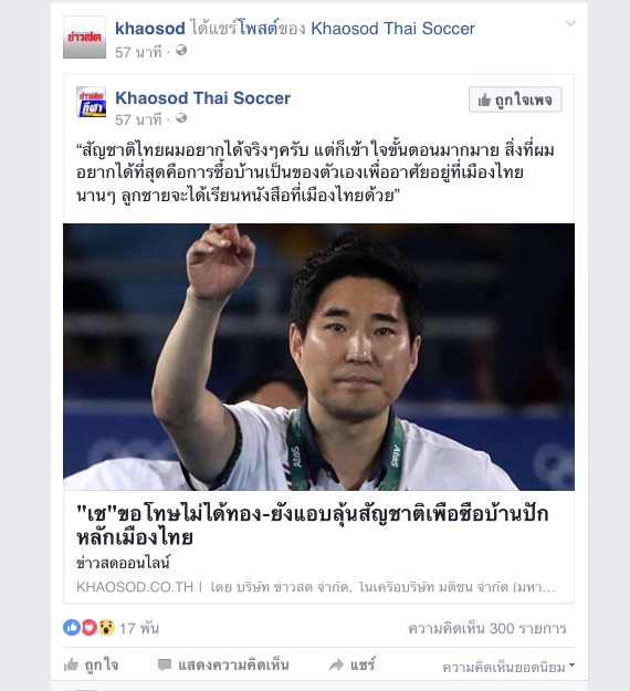 ขอสนับสนุนเรื่องสญชาติไทยให้โค้ชเชครับ หวังว่ารัฐบาลลุงตู่จะพิจารณา