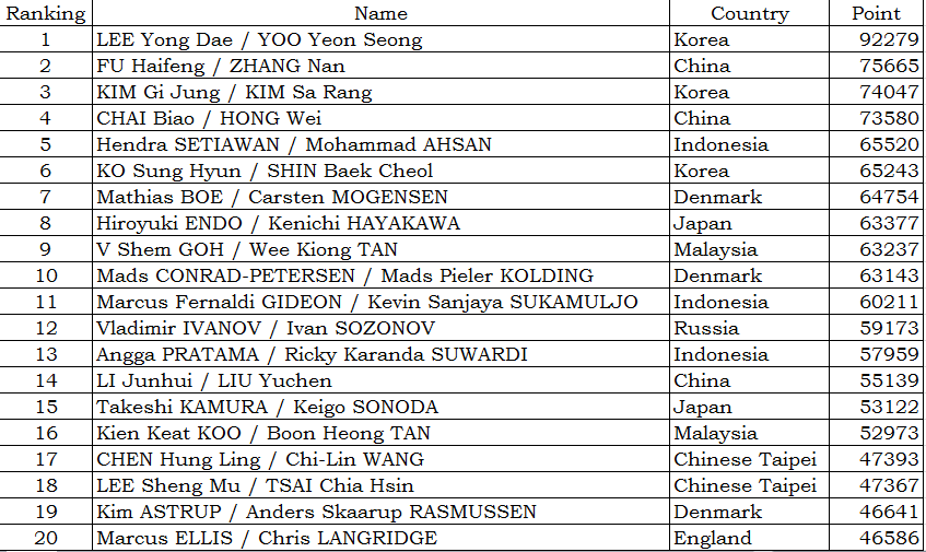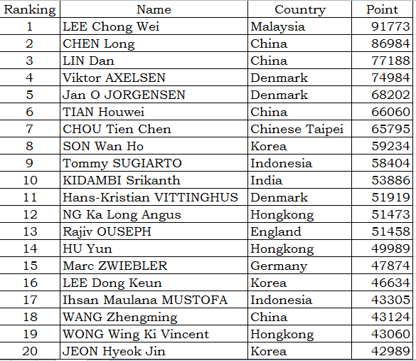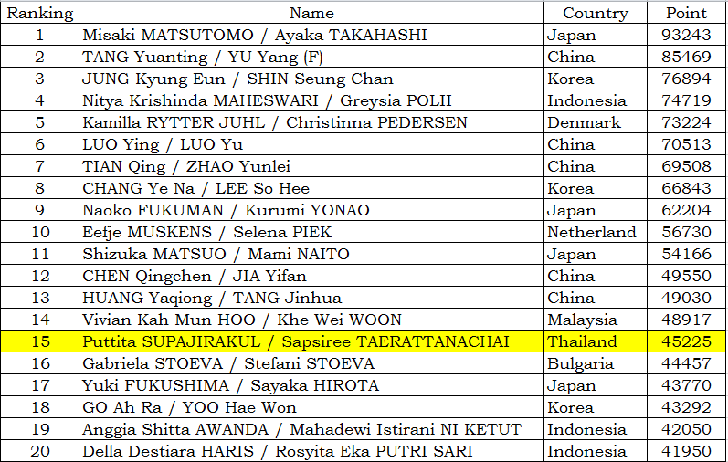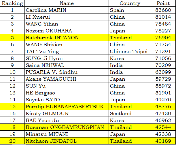 อันดับโลก หลังจบโอลิมปิกเกมส์ 2016