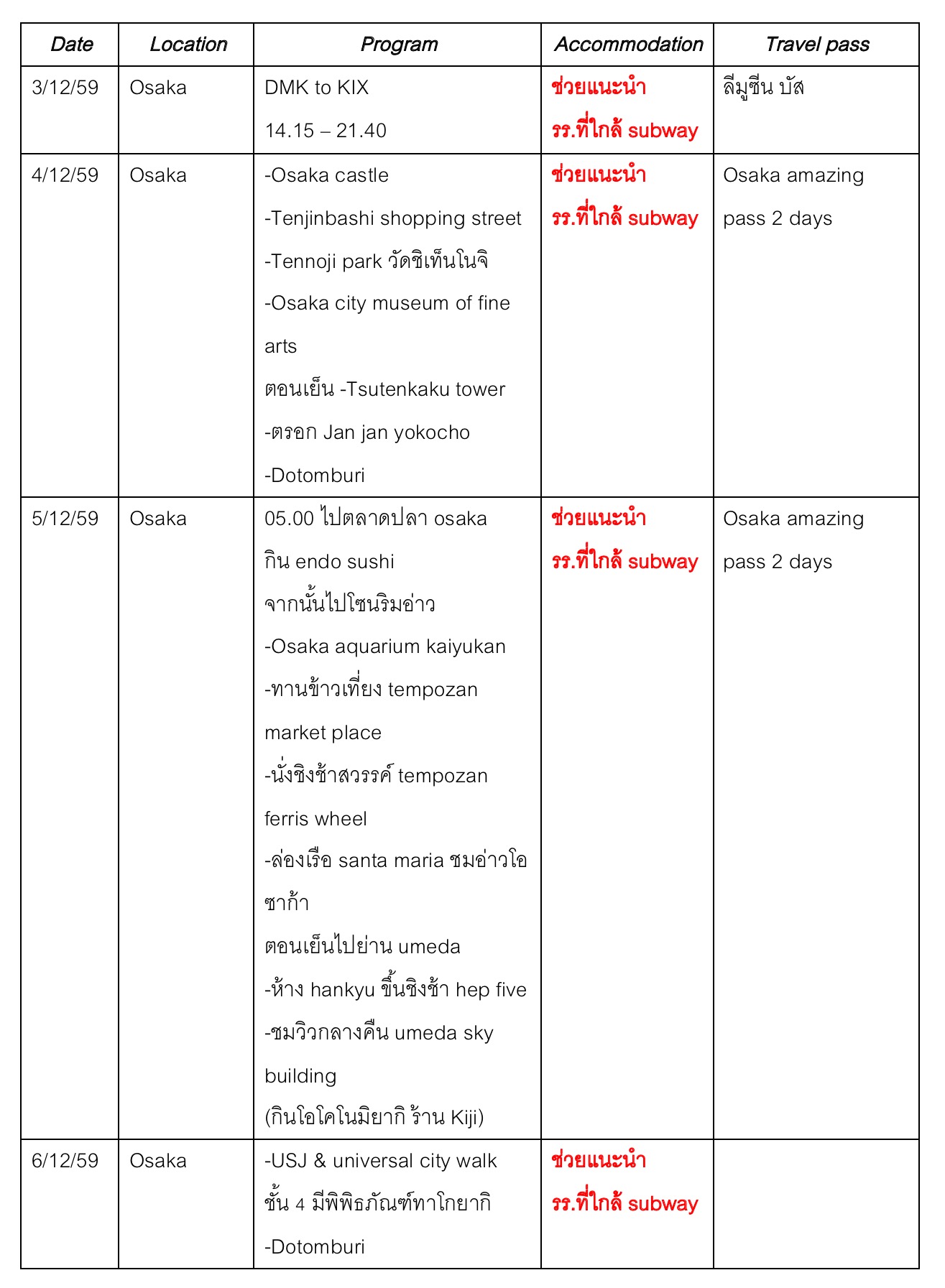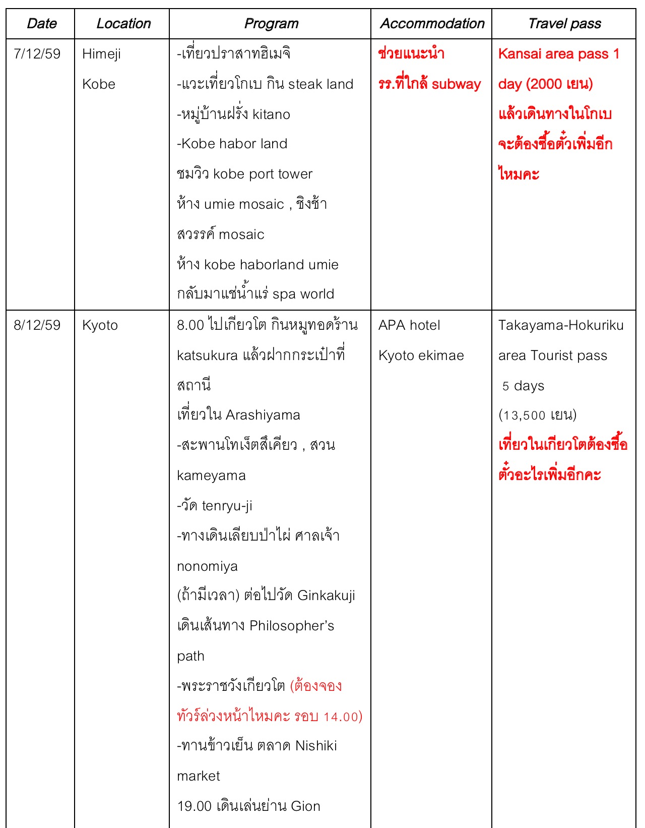ทำให้จขกท.ตัดสินใจเปลี่ยนแพลนท่องเที่ยว มาเที่ยวในแถบคันไซและแถบชูบุอย่างที่เพื่อนๆแนะนำค่ะ จึงอยากขอรบกวนเพื่อนๆอีกรอบ ช่วยดูแพลนรอบนี้ และแนะนำ pass การเดินทางรวมถึงโรงแรมให้ทีค่ะ ตอนนี้เท่าที่จขกท.ทราบมีแต่ pass นี้ ซึ่งลองบวกๆดูแล้ว แพงเอาเรื่องเหมือนกัน 555