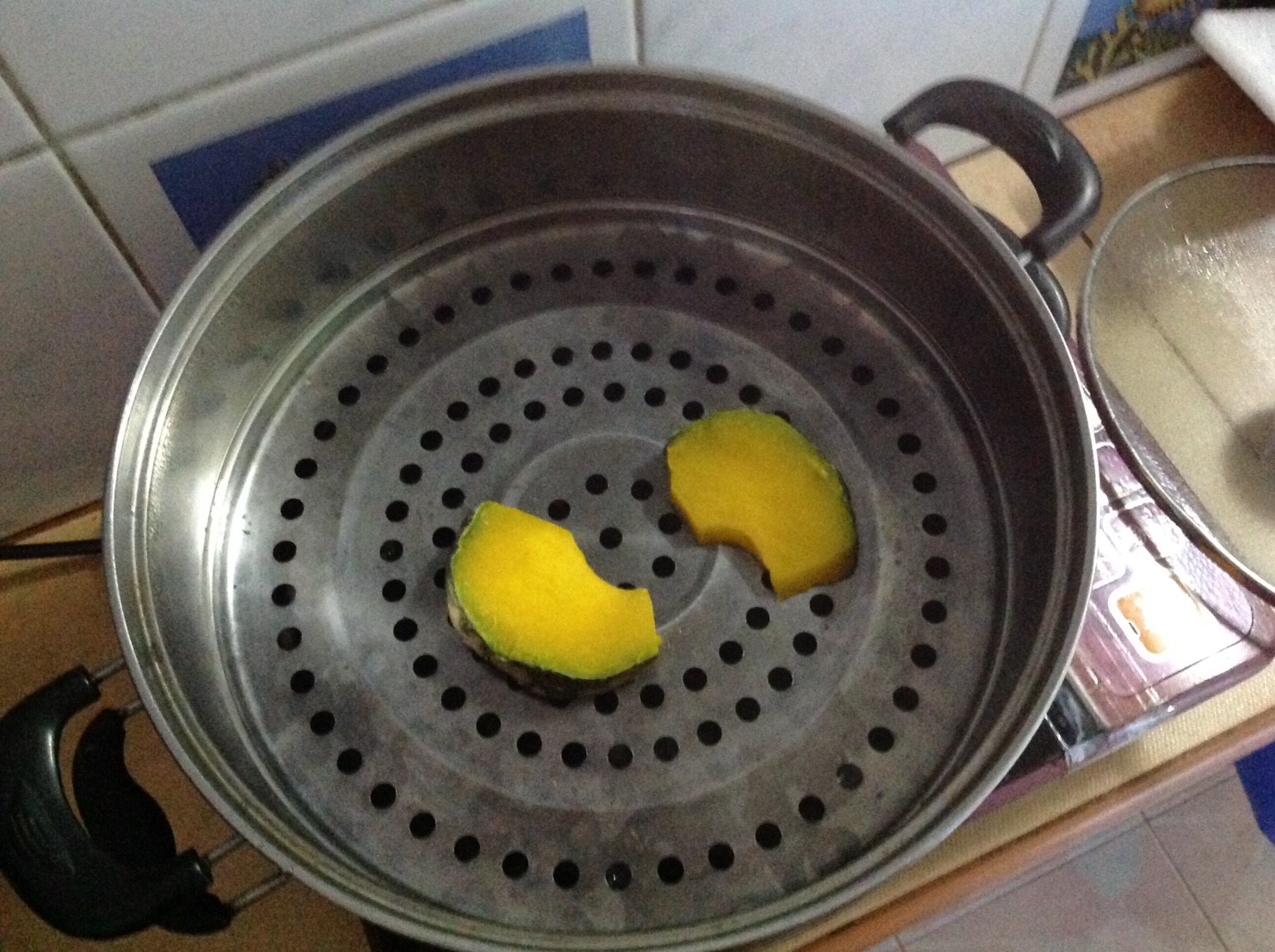1.ขั้นตอนแรกให้เรานำฟักทองไปนึ่งซะก่อนนะครับ ให้นิ่มไปเลยนะครับ