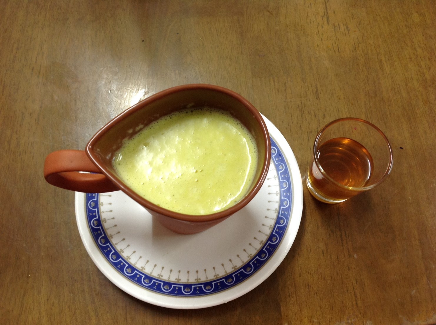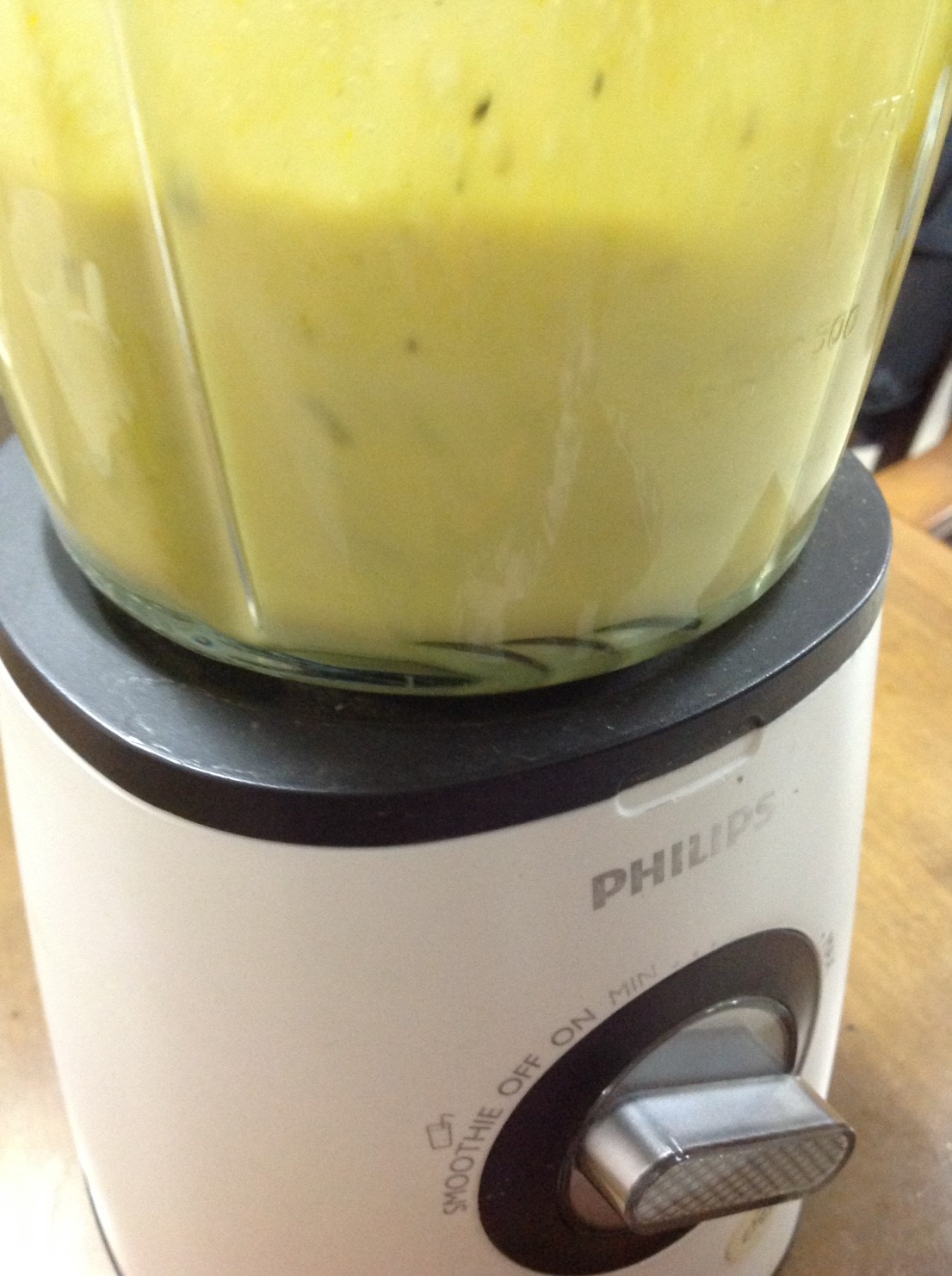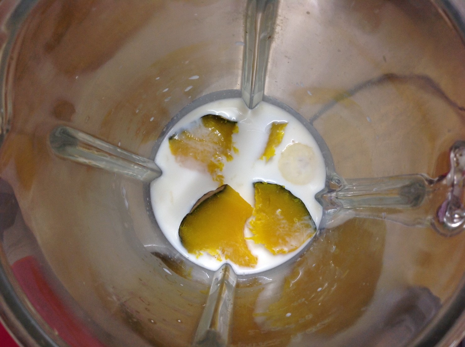 4.หลังจากที่เราใส่นม กล้วย น้ำผึ้ง ระหว่างฟักทองของเราก็จะนิ่มพอดี เราก็จัดการใส่ลงในโถปั่นเลยครับ ก็เป็นอันที่เรียบร้อย (รอขึ้นเขียงได้ 555)