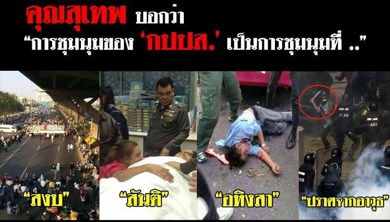 ทำให้ผมนึกถึง กลุ่มคนที่ไม่ตระหนักถึงผลกระทบกับประเทศ ไม่สำนึกถึงความสงบสุขของประชาชน ไม่ว่าจะเป็นการยึดสนามบินก็ดี ไม่ว่าจะเป็นการปิดกรุงเทพก็ดี ไม่ว่าจะเป็นการขัดขวางการจ่ายเงินให้กับชาวนาก็ดี ไม่ว่าจะเป็นการขัดขวางการเลือกตั้งก็ดี ไม่ว่าจะเป็นการตีความกฎหมายตามใจชอบก็ดี ไม่ว่าจะเป็นการเอียงข้างขององค์กรอิสระก็ดี หรือแม้กระทั่งการประกาศตัวเป็น รัฎฐาธิปัตย์ โดยเจ้าพนักงานละเว้นการปฏิบัติในการจับกุม