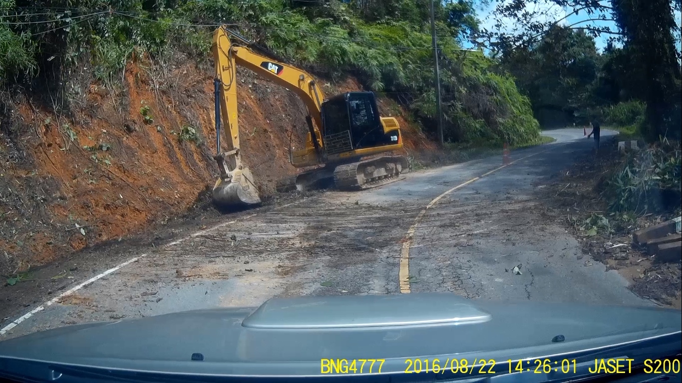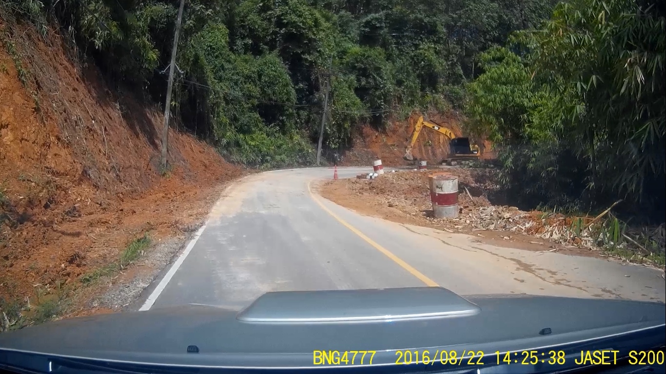 แล้วก็พบกับการซ่อมถนน ที่มีเพียง จนท. 2 คน คือ จนท.โบกให้สัญญาณรถแต่ละฝั่ง กับ จนท.ขับรถแม๊คโคร