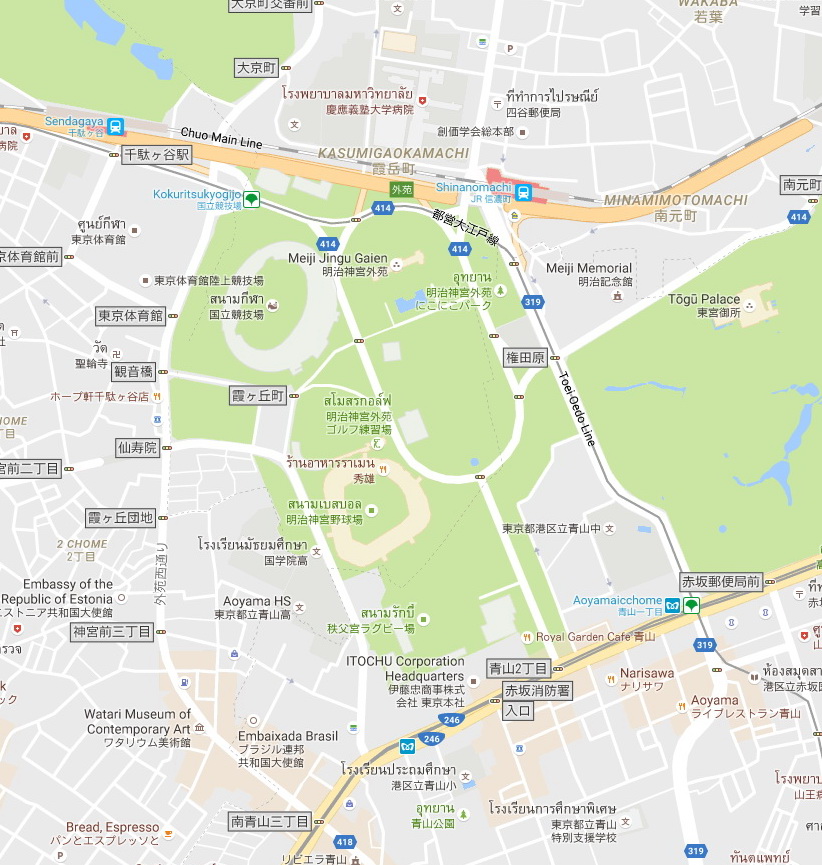 Access to the stadium was from Sendagaya or Shinanomachi stations along the JR Chūō-Sōbu Line; from Kokuritsu Kyogijo Station on the Toei Oedo Line; and from Gaienmae Station on the Tokyo Metro Ginza Line.
