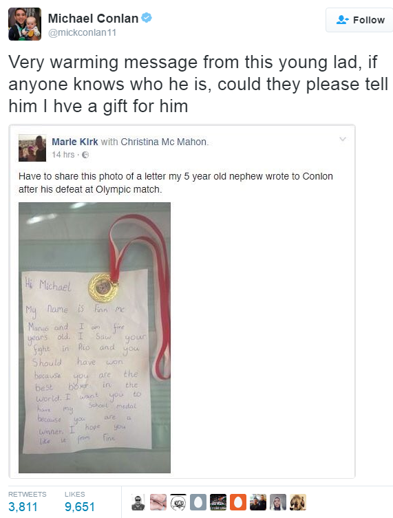 อ่านแล้วอมยิ้มแทนเลย จดหมายประโยคง่ายๆจากเด็ก 5 ขวบนามว่า ฟินส์ แมคมานัส แต่กินใจดีมอบเหรียญทองจากกีฬาของโรงเรียนเค้าให้แทน ส่วน ไมเคิลคอนแลน ก็ประกาศว่าถ้าใครรู้จักหนูน้อยคนนี้ให้ช่วยบอกเค้าหน่อย มีของรางวัลจะให้ด้วย