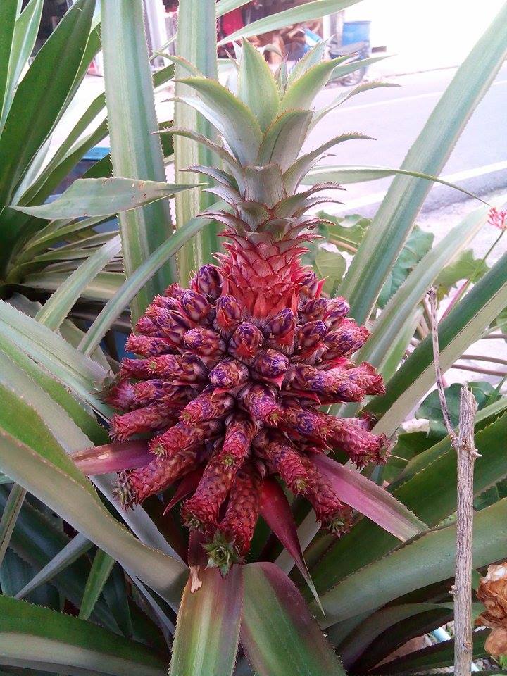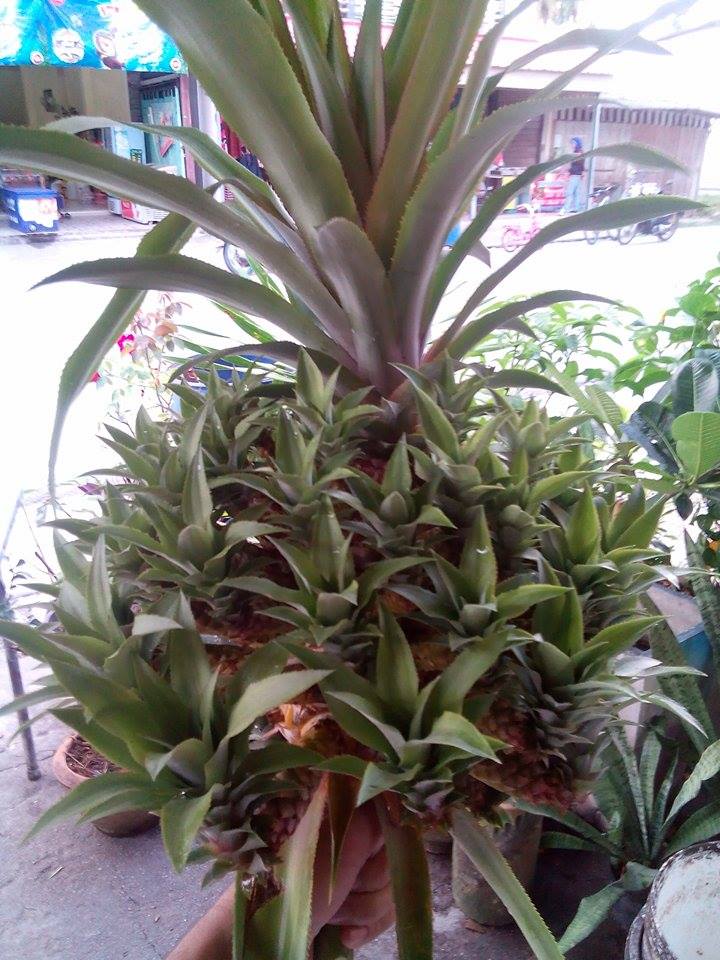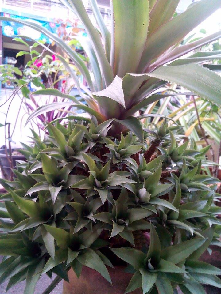 เมื่อหลายเดือนก่อนมีคนเอาต้นสับปะรดมาให้ที่บ้าน 2 ต้น เห็นบอกว่าเป็นสับปะรดสี ผ่านไปสักพักก็เริ่มเป็นผลสับปะรด แต่สงสัยทำไมสับปะรดสีผลใหญ่จัง หลังจากนั้นก็เริ่มมีหน่อออกมาจากตาสับปะรด เฮ้ยแปลกดีอ่ะ แบบนี้ครับ