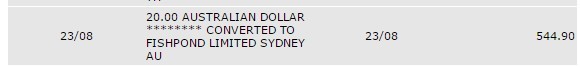 ตามหัวข้อเลยค่ะ วันนี้ลองเช็คค่าใช้จ่ายออนไลน์ของ บัตรเครดิตธนาคารกสิกร ของตัวเอง ปรากฏว่ามีการเรียกเก็บเงินจาก FISHPOND LIMITED SYDNEY AU เป็นจำนวนเงิน 20 AUSTRALIAN DOLLAR ตัดบัตรไป 544.90 บาท เกินจำนวนวงเงินไป 57.60 บาท