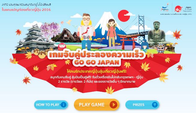 http://www.jnto.or.th/ จัดกิจกรรมเล่นเกมเพื่อชิงรางวัลตั๋วเครื่องบินไปเที่ยวญี่ปุ่น ผู้สนใจสามารถเล่นเกมได้ผ่านทางอินเทอร์เน็ตแบบง่าย ๆ เพียงแต่ลงทะเบียนก่อนเข้าร่วมเล่นเกมหรือใช้บัญชีของ Facebook และสะสมคะแนนไปเรื่อย ๆ ผู้ที่ได้คะแนนสูงสุดจะได้รับรางวัล