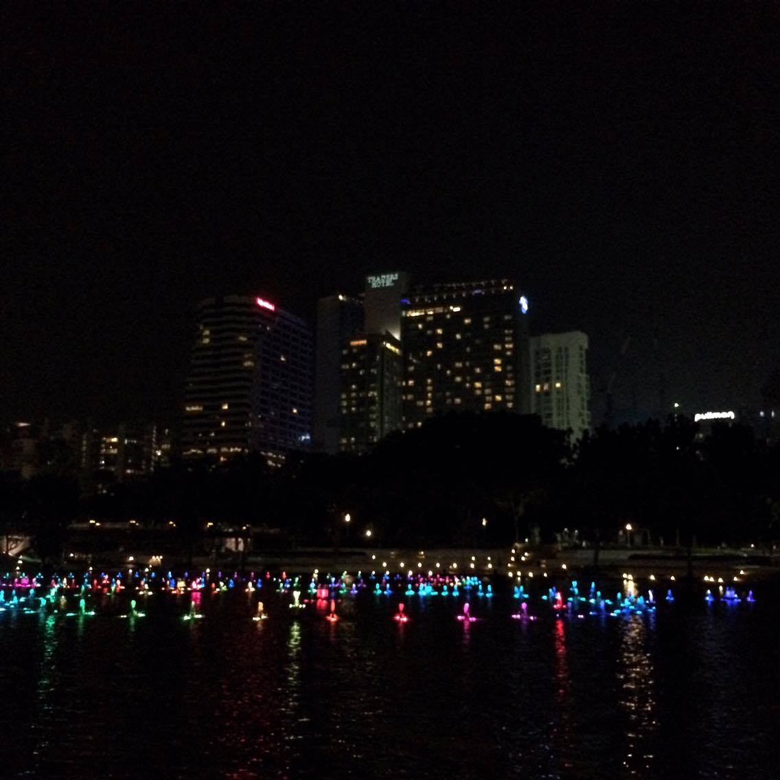 พอเลือกซื้อของฝากเสร็จเรียบร้อยก็เป็นเวลาประมาณหนึ่งทุ่มแล้ว เราจึงเดินทางต่อไปยังสถานี KLCC ในราคา 1.6 ริงกิต เพื่อไปชมตึก Petronas twin tower แลนด์มาร์คหลักของที่นี่ และ ชมน้ำพุเต้นระบำที่ด้านหลังของห้าง Suria เมื่อไปถึงตึกแฝดพบว่าคนเยอะมากคะ และความฉลาดก็นั่งรอดูน้ำพุนานมากเพราะนึกว่าน้ำพุอยู่หน้าตึกแฝด 555 รอจนร้อนเลยเดินเข้าตึกแฝดทะลุไปห้างซูเรีย กว่าจะถึงบางอ้อ น้ำพุก็เกือบจบแล้ว (เขินจัง) แต่ก็สวยคะ คุ้มที่คนมานั่งรอดูกัน แนะนำว่าถ้าไม่ต้องการไปตอนกลางคืนตรงบริเวณนี้มีสวนสาธารณะ และ สวนน้ำเล็กๆค่ะ สามารถไปเดินเล่นกินบรรยากาศสีเขียวกลางเมืองได้